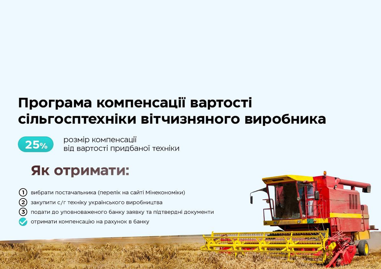 “Підтримка українського виробника та його розвитку, стимулювання попиту на зроблене в Україні - основа нашої державної політики. Одна зі складових цієї політики - програма часткової компенсації аграріям вартості придбаної сільгосптехніки локального виробника. На сьогодні агрокомпанії можуть отримати 25% компенсації за куплену сільгосптехніку вже 86 виробників — це майже 8 тисяч номенклатурних позицій. Тобто кількість виробників у реєстрі системно зростає. Розраховуємо, що завдяки програмі попит на українську сільгосптехніку зросте, що стимулюватиме збільшення обсягів її виробництва, як це було в попередні роки дії програми. Цьогоріч на компенсації за купівлю української сільгосптехніки ми заклали в бюджет 1 млрд грн”, - зазначила Перший віцепрем’єр-міністр України - Міністр економіки Юлія Свириденко.